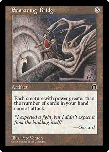 If your opponent’s deck is aggressive, Pit Rack protects itself with Innocent Blood, a powerful one-drop removal spell that answers Jackal Pups and Phyrexian Dreadnoughts alike. As mentioned earlier, you can always play out an Ensnaring Bridge, which can usually prevent you from dying as long as you have dumped your hand onto the board.