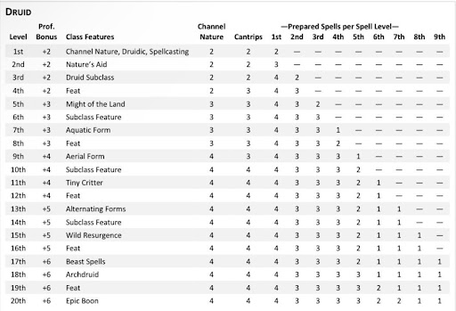 I will now go into depth on the changes to the druid class for the new handbook. The first change is they provided the players with the class group and their primary ability. For a druid, the primary class is priest, and the primary ability is Wisdom. The new updated class feature table can be found below: